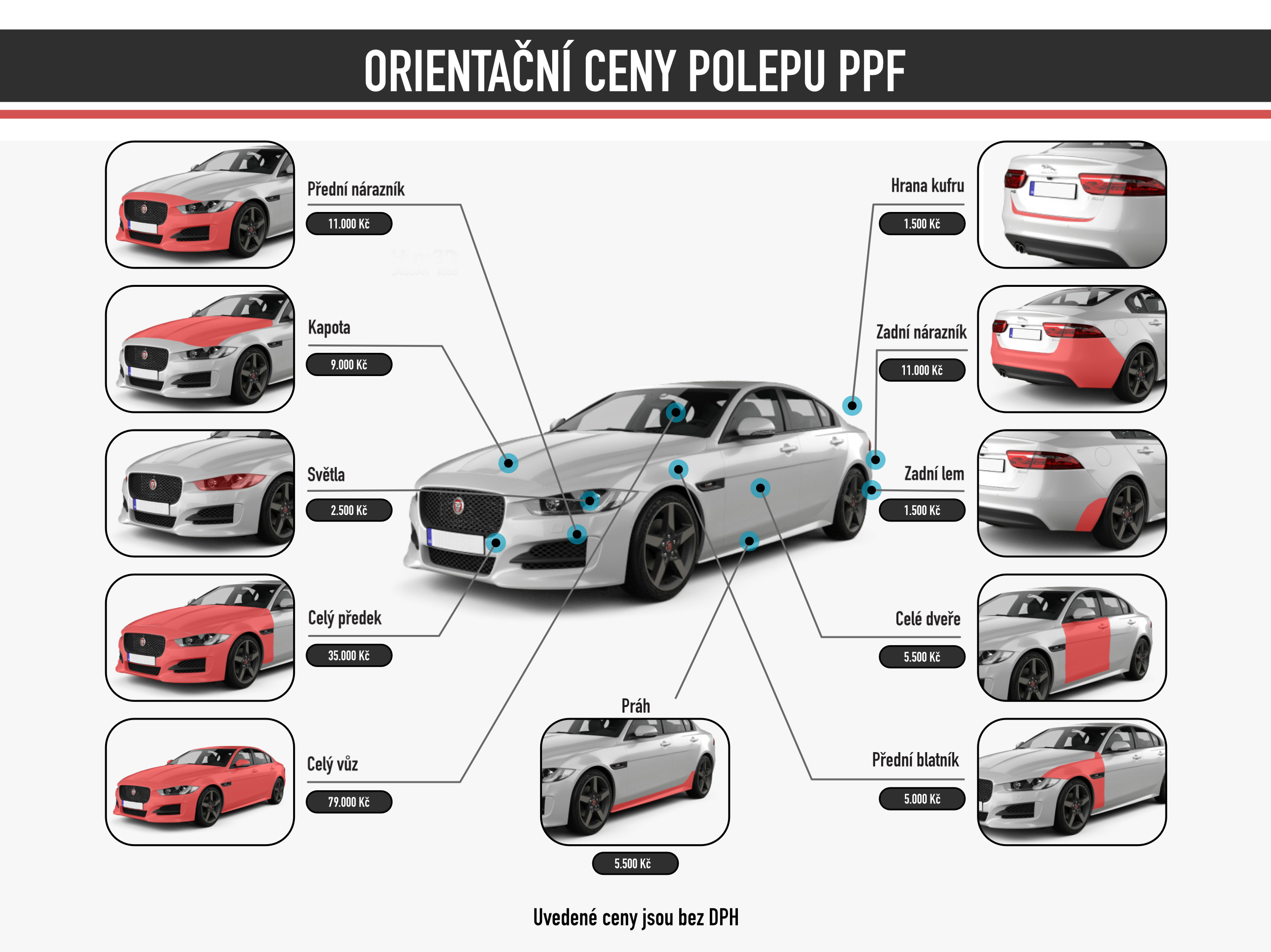 PPF fólie patří mezi dražší typy ochrany laku. Jde o prémiovou technologii s dlouhou životností a špičkovými vlastnostmi, která vyžaduje odbornou aplikaci. Cena PPF fólie se odvíjí od typu vozu, rozsahu polepu a zvoleného materiálu. Nabízíme částečné polepy i kompletní ochranu celého vozu.